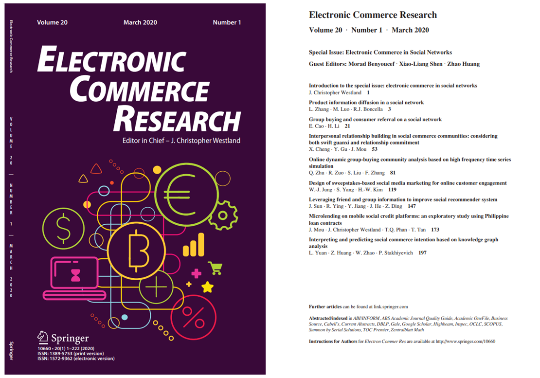 近日,由海角社区 沈校亮教授担任客座主编的SSCI期刊《Electronic Commerce Research》特辑(Special Issue)“Electronic Commerce in Social Networks”于2020年3月在该期刊第20卷第1期正式出版。