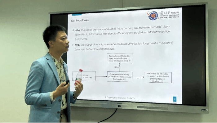 殷云露老师从机器人迅速进入众多工作场所和生活场景这一现象出发,指出人们在机器人在场的情况下做出决策的情况也越来越普遍。然而,殷老师的研究发现了拟人机器人的存在会增加人类对效率而非公平的偏好。通过一项眼动跟踪实验和一项现场实验,殷老师阐明了出现这种效应的原因是当机器人在场时,人们往往自发地反映并融入了机器人的功利主义观点,进而在分配决策中更加追求效用最大化。殷老师进一步指出,在人与机器人的互动过程中,机器人的存在可能会触发和影响人类的元认知,因此管理者和政策制定者应注意拟人机器人可能会对人类道德相关决策产生意想不到的影响,尤其是在涉及一般社会福利或法律后果的情况下。殷老师还分享了一些前沿的营销科学研究方法,与会师生表现出了浓厚的兴趣,展开了热烈的讨论和互动。