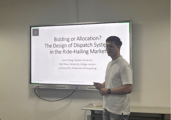 聚焦于网约车市场中两种常见的中央调度系统——一种是司机对订单请求进行竞标的竞标系统,另一种是通过算法匹配乘客和司机的分配系统,张学立老师开发了一个模型来探讨哪种模式更有效率。这一模型包含了进行竞标、出行决策的司机的有限视界动态寡头垄断博弈,以及对交通工具进行离散选择的乘客的随机到达模式。基于新加坡出租车市场的运营数据,张老师发现,分配系统在提升乘客福利和司机收入方面均优于竞标系统。然而,司机收入的增加在不同出行类型之间的分布是不均匀的。这促使司机能够以完成更少的街叫出行为代价,选择更多的预约出行。最终,这种行为导致了一些意想不到的后果——街头叫车的司机数量减少,以及街头叫车和预约行程的未满足需求增加。老师们就网约车系统两种机制、博弈模型调试等问题展开讨论。