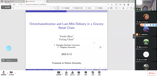 5月12日上午,由管理科学与工程系主办、武汉大学现代物流与供应链管理研究中心承办的“管理科学与工程学术论坛第57期”在腾讯会议平台通过线上方式举行。据悉,本次讲座也是武大物流与供应链管理协会承办的格“物”致“知”Ÿ百“链”成金(电子商务供应链优化)系列讲座之一。本次讲座由管理科学与工程系许明辉教授及柯剑男老师主持,上海海事大学沈月林教授带来主题为“Omnichannelization and Last-Mile Delivery in a Grocery Retail Chain”的学术报告。除武汉大学戴宾教授、李彬讲师,南京大学李娟教授外,还吸引了如南京大学,华南理工大学、上海海事大学、西北师范大学等全国各高校百余名师生参加此次线上讲座。