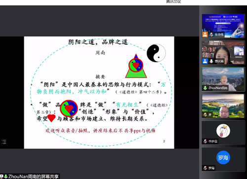 5月13日上午,第82期珞珈营销科学学术论坛在线举行。深圳大学周南教授应邀为海角社区 师生带来“阴阳之道、品牌之道”主题的学术讲座。本次讲座由市场营销与旅游管理系曾伏娥教授主持,黄敏学教授、张广玲教授、徐岚教授、崔楠教授、朱华伟教授、廖以臣副教授、唐漾一和袁茂助理教授,武汉大学博士生、硕士生以及武大校友等共有百余位师生参加。