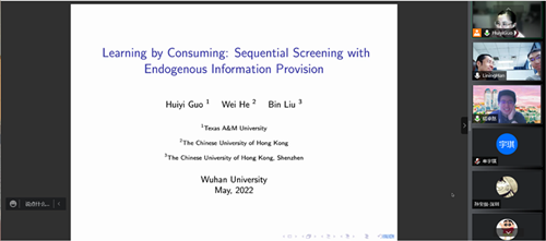 2022年5月19日上午,经济学高级研究论坛第182期如期在线举行。本次讲座由数理经济与数理金融系韩立宁老师主持,邀请德州农工大学郭汇一老师带来主题为“Learning by Consuming: Sequential Screening with Endogenous Information Provision”的学术报告。学院孙祥、杨朔、胡枭骁等多位老师和学生参加了此次论坛。