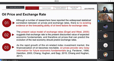 第217期讲座,张群姿教授带来主题为“Oil Strikes Back : Trend Factors and Exchange Rates”的学术报告。首先,张教授介绍了研究动机,通过比较石油价格与美元与卢布的汇率,发现主要产油国之间的汇率波动与影响石油价格的重大历史事件相关,因此石油价格是否可以预测汇率走势需要被深入讨论。其次,张教授对相关文献做了详细介绍,重点介绍了米斯和罗格夫之谜(Meese-Rogoff puzzle),并提出了本文的目标:构建油价趋势因子之后,希望统计上可以显著预测汇率,并为预测能力提供解释。接着,张教授详细介绍了研究中的变量构造与实证结果:研究构建了一个比随机游走模型表现更好的石油趋势因子,并进行样本内回归和样本外分析,发现石油趋势因素的增加与美元相对于外币的升值有关。随后,张教授通过采用不同的预测区间、把基本货币从美元换成一揽子货币等方式进行稳健性检验。最后,张教授介绍了研究结果,石油趋势是汇率回报和经济变量的重要决定因素;石油趋势因素的预测能力超过随机游走模型(Random Walk Model),其与未来经济状况有很强的联系。