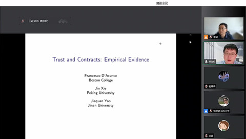 第218期讲座,暨南大学姚加权教授带来主题为“Trust and Contracts : Empirical Evidence”的学术报告。首先,姚教授介绍了本文的研究背景,重点介绍了信任与合约的完全性,并认为代理条款、信任会影响合约的代理成本,进而导致合约的不完全。其次,姚教授展示了本项研究的数据及模型,本项研究从美国证券交易委员会的文件中构建美国公司和顾问之间的大量委托代理合同样本,并用文本分析衡量完整性,同时采用主题模型Latent Dirichlet Allocation用于提取合同中的主题。接着,姚教授介绍了安达信丑闻冲击。2002年安达信丑闻后大企业受公众的信任度急剧下跌,信任的下降是否由安达信丑闻造成的呢?姚教授验证了安达信事件是合格的有关信任的负面外生冲击,并采取双重差分方法展开研究,结果显示在安达信客户越多的州,信任程度下降越严重。最后,姚教授讨论了竞业协议的例子,并强调信任程度下降会增加合约的完全性。