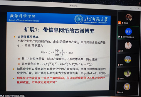 张博宇老师首先向我们介绍了网络上的对称博弈。团队成员在此方向上的主要贡献是给出了任意网络上对称博弈的边近似方法和扩散近似方法;推导了网络对称博弈中,生灭过程、灭生过程和择优模仿对应的确定性演化动态;通过行为实验,发现环形规则网和星形网不促进合作。此外,还介绍了该模型对于带有信息网络的古诺博弈的扩展。随后介绍了其在网络上的非对称博弈动态方面的主要研究成果。张博宇老师对非对称博弈动态依旧进行了扩展案例分析:网络上的舆情传播模型。