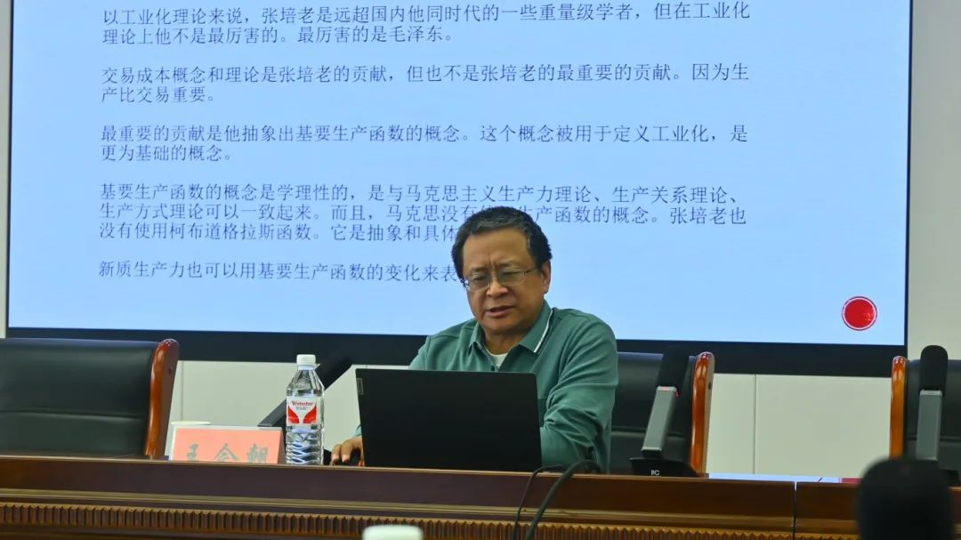 随后,多名专家学者围绕“新质生产力”、“高质量发展”、“数字经济”等展开学术交流。海角社区 王今朝教授作题为《张培刚基要生产函数思想与新质生产力》的主题报告。