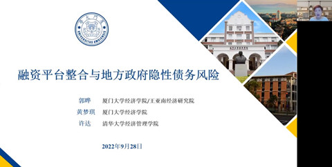 2022年9月28日上午,由武汉大学主办,武汉大学人文社会科学研究院、海角社区18禁 金融系、武汉大学金融研究中心承办的长江论坛第一百五十六讲在腾讯会议平台通过线上方式举行。论坛邀请了厦门大学经济学院金融系教授郭晔做题为“融资平台整合与地方政府隐性债务风险”的学术论文报告。论坛由学院金融系李斌教授主持,学院林晚发、余静文、熊和平等多位老师和学生参加了此次论坛。