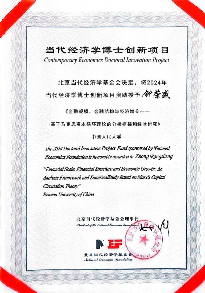 2024年当代经济学博士创新项目资助证书