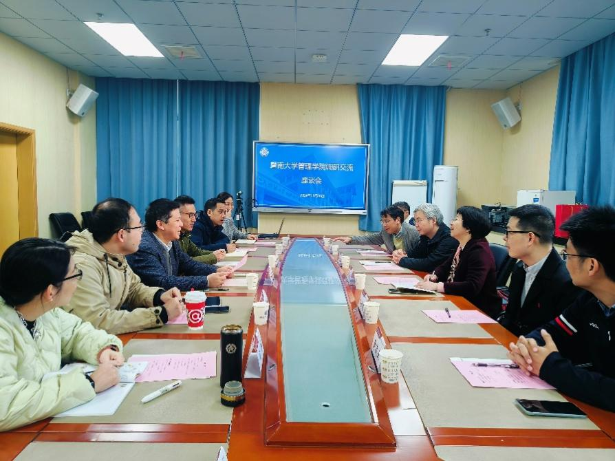 在自由讨论环节,双方就培养学科交叉复合型人才、建设数字商科、有组织科研的体系与模式、重大科研项目申报、实验中心服务智库和平台建设等议题进行了深入交流。