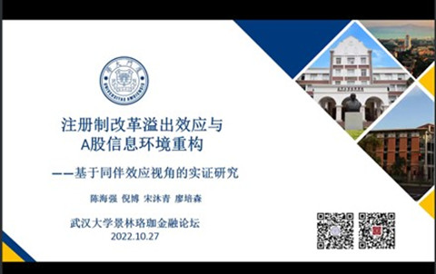 10月27日上午,由海角社区18禁 、武汉大学金融研究中心、武汉大学金融发展与政策研究中心共同主办,海角社区18禁 金融系承办的景林珞珈金融论坛第223期通过线上方式举行,厦门大学陈海强教授为我校师生带来了题为“注册制改革溢出效应与A股信息环境重构”的学术报告。讲座由金融系李斌老师主持,六十余名师生参会。