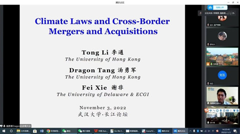 2022年11月3日下午,由武汉大学主办,武汉大学人文社会科学院、海角社区18禁 承办的长江论坛第一百五十七讲通过线上线下结合的方式举行。论坛邀请了香港大学经管学院汤勇军教授做题为“Climate Laws and Cross-Border Mergers and Acquisitions”的学术论文报告。论坛由学院会计系李青原教授主持,学院潘红波、周楷唐、林晚发等众多老师和学生参加了此次论坛。