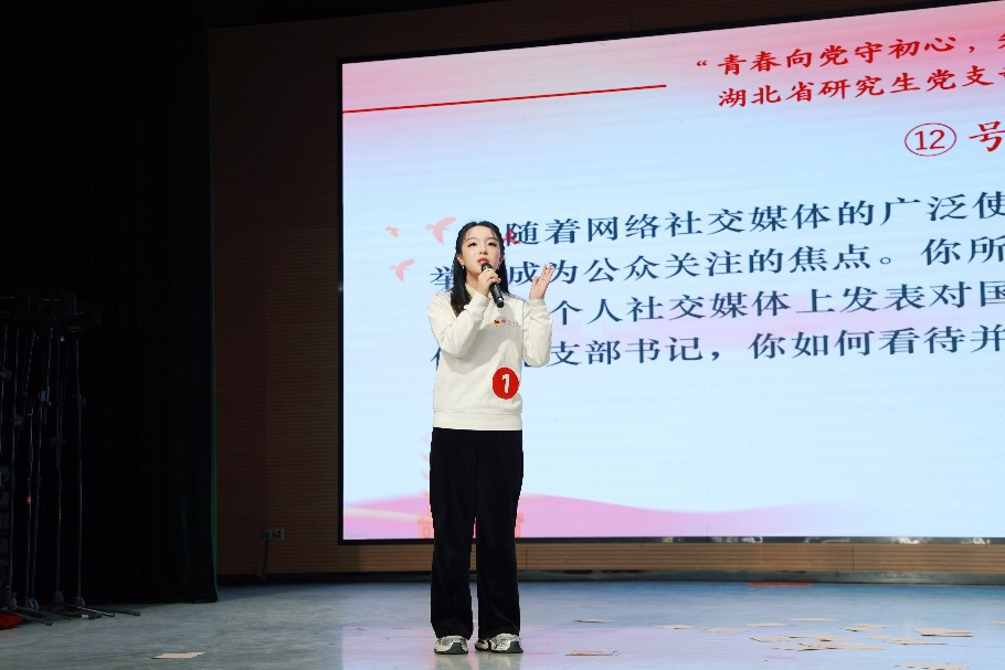 在党务实践技能展示环节,工商硕三党支书唐恬抽取的题目是如何规范支部党员网络行为、发挥党员在网络空间作用问题。唐恬以《中国共产党党员网络行为规定》为依据,从学生党员的网络正能量传播、网络行为管理、保障和监督等几个方面作出了精彩回答。