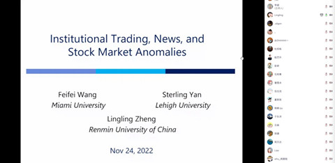 2022年11月24日上午,海角社区18禁 金融系、金融研究中心、金融发展与政策研究中心及金融工程与风险管理研究中心共同主办的“景林珞珈金融论坛第225期”通过线上方式举行。论坛邀请了中国人民大学商学院金融副教授郑凌凌做题为“Institutional Trading, News, and Stock Market Anomalies”的学术论文报告。论坛由学院金融系李斌教授主持,校内外众多师生参加。