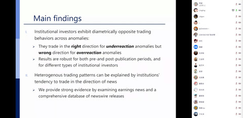 接下来,郑凌凌老师向大家展示了三个主要的研究发现:第一,机构投资者对两类异象具有不同的交易行为,具体表现为正向交易“反应不足”的异象,反向交易“过度反应”的异象。对异象公告前后时间和不同类型的机构投资者进行划分和检验,结果依旧稳健;第二:机构投资者倾向于基于新闻的好坏来进行交易,此动机可以解释他们面对两种异象的不同交易模式;第三,机构交易加重了“反应不足”的异象在市场上错误定价的程度,使其未来收益更高。对于“反应不足”的异象则产生相反影响。