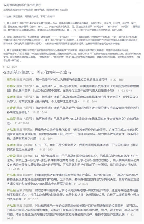 以“区域货币合作”这一章节为例,学生就欧元区的建立、拉美国家美元化、亚洲货币合作等问题结合在线资料,在平台进行了小组展示,展开答辩与互评。
