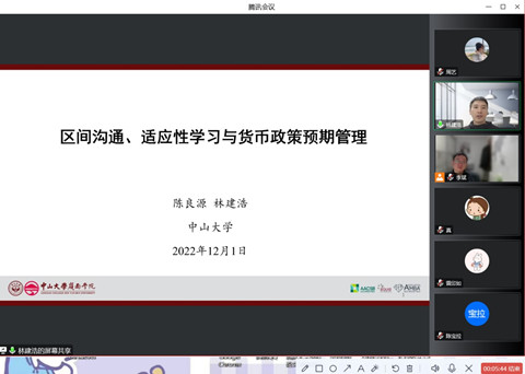2022年12月1日上午,由海角社区18禁 金融系、金融研究中心、金融发展与政策研究中心及金融工程与风险管理研究中心共同主办的景林珞珈金融论坛第226期在腾讯会议平台通过线上方式举行,中山大学林建浩教授为海角社区 师生带来了题为“区间沟通、适应性学习与货币政策预期管理”的学术报告。讲座由金融系李斌老师主持,三十余名师生参加论坛。
