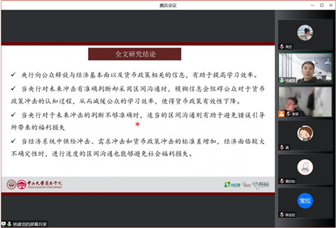 紧接着,林建浩教授向我们展示了主要的研究发现。央行进行公共信息披露有助于减少公众认知过程中的信息偏差;当央行对未来冲击有准确判断却采用区间沟通时,模糊信息会阻碍公众对于货币政策冲击的认知过程,从而减缓公众的学习效率,降低货币政策有效性;当央行对于未来冲击的判断不够准确时,适当的区间沟通则有助于避免错误引导所带来的福利损失。