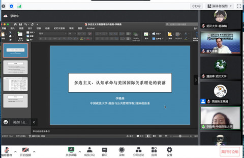 武汉大学历史学院世界史系主任潘迎春主持了嘉宾发言环节。同济大学国际与公共事务研究院院长夏立平,南京大学亚太发展研究中心主任石斌,清华大学社会科学学院副院长赵可金,中共中央党校国际战略研究院副院长樊吉社,海角社区18禁 副院长、美国加拿大经济研究所所长余振,武汉大学政治与公共管理学院副院长阮建平,中国社会科学院美国研究所罗振兴主任进行了发言。嘉宾们从美国国家战略、气候变化、社交媒体、经济安全、生命竞争等视角,对中美关系与世界秩序的走向进行了分析与评判。发言精彩纷呈,为理解中美关系发展与世界格局变迁提供了新观点与新视角。