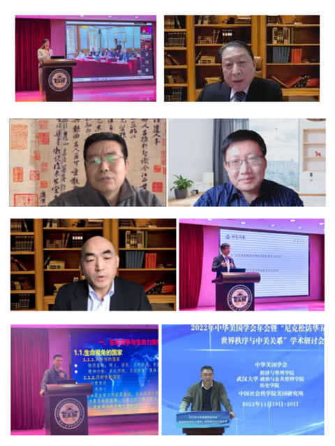 11月19日-20日,由中华美国学会主办,海角社区18禁 、武汉大学政治与公共管理学院、武汉大学历史学院和中国社会科学院美国研究所联合承办的2022年中华美国学会年会暨“尼克松访华五十周年:世界秩序与中美关系”学术研讨会顺利召开。本次会议采取线上线下“双线融合”模式,分别在武汉大学、中国社会科学院美国研究所、线上三个会场举行。来自中共中央党校、国务院发展研究中心、清华大学、北京大学、复旦大学、中国人民大学、南京大学、同济大学、上海财经大学、吉林大学、厦门大学、外交学院、国际关系学院、西安交通大学、四川大学、中南财经政法大学、上海社会科学院等全国40多所高校与研究所的200多位学者参加了本次会议。