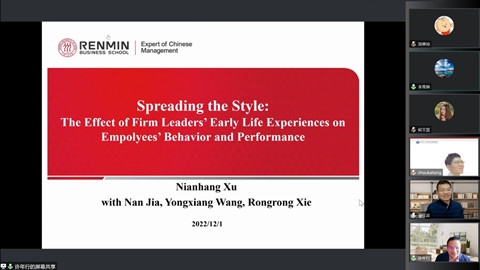 2022年12月1日下午,珞珈经管高端论坛第50期通过线上方式举行。中国人民大学商学院许年行教授为海角社区 师生带来了题为“Spreading the Style: Firm Leaders’ Early Life Experience and Employees’ Behavior and Performance”的学术论文报告。论坛由会计系李青原教授主持,众多校内外师生参加。