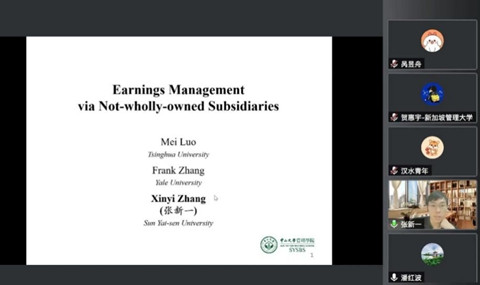 12月22日下午,由会计系主办的“蓝月亮珞珈会计论坛第108期”通过线上方式举行。本次讲座由会计系潘红波教授主持,中山大学管理学院张新一老师带来题为“Earnings Management via Not-wholly-owned Subsidiaries”的学术报告。学院廖珂、周楷唐等多位老师和学生参加。