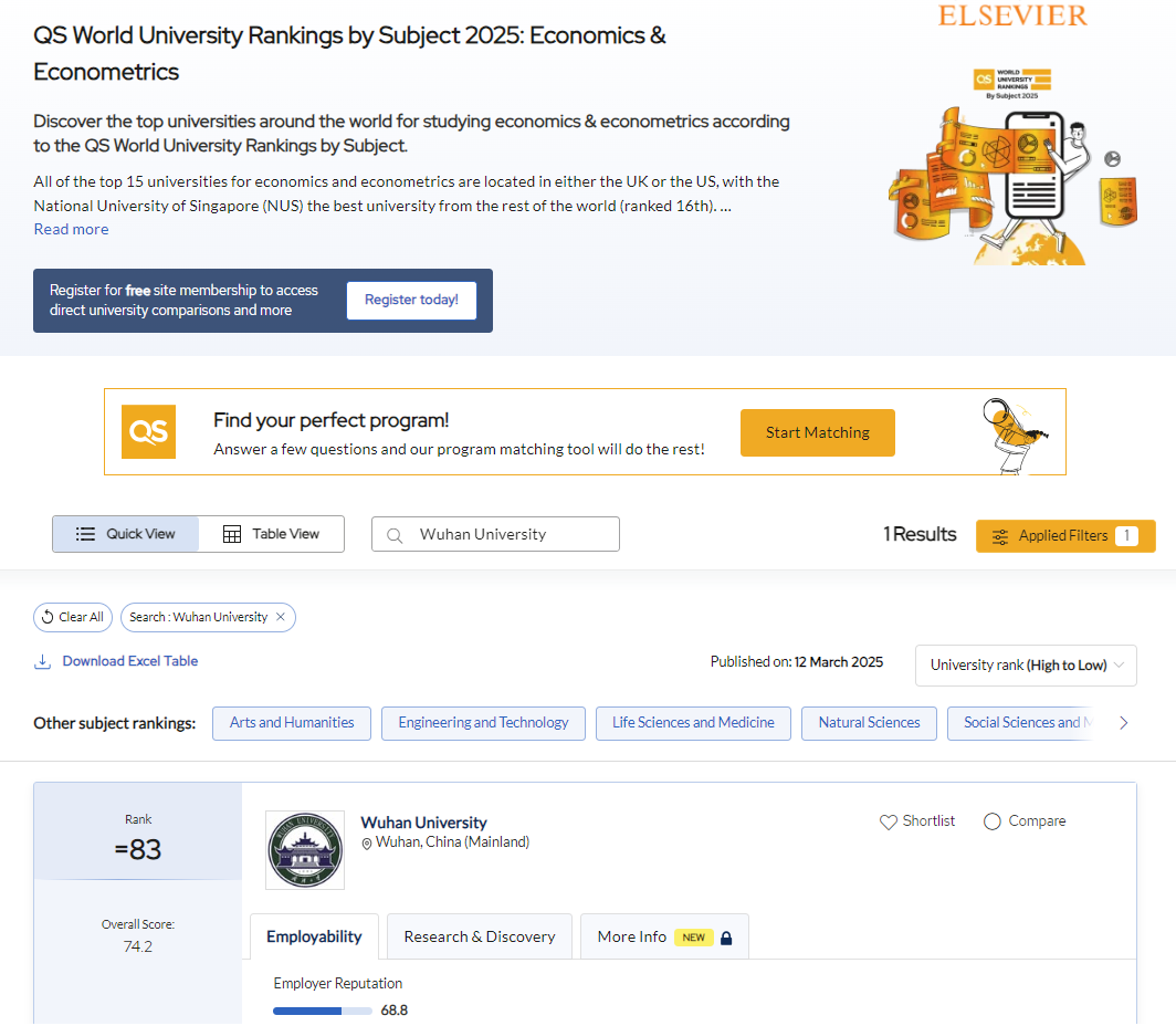 近日,国际高等教育研究机构 QS (Quacquarelli Symonds) 发布2025年QS世界大学学科排名。我校经济与计量经济学(Economics & Econometrics) 学科位列世界第83名。