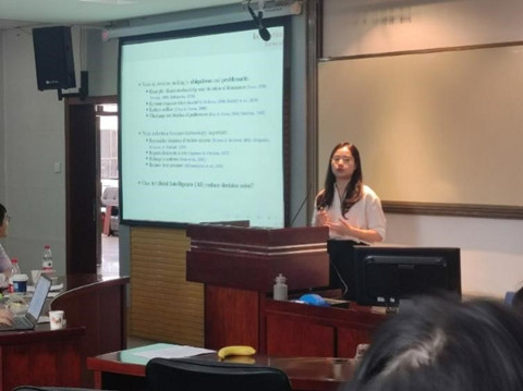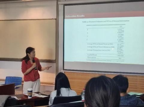 接着,来自武汉大学的薛莲老师报告了题为“Strategic Interactions with an Algorithm Assistant: The Power of Data and Mechanism”的最新研究,她探究个人接受基于人工智能(AI)算法的建议意愿,并将数据可用性和算法机制作为算法接受度的主要驱动因素,提出substitution effect和complementary effect两种效应。该研究结果提供了促进用户信任算法的条件的见解,并讨论了引入AI对社会福利的影响,这将对市场和经济产生重要影响。