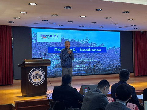 主题报告环节,新加坡国立大学的柯滨教授为大家带来了“ESG,AI,Resilience”的主题报告。柯滨教授讲述了本次研讨会主题ESG的基本概念,发表了对于ESG度量和评级的独到见解。柯滨老师还系统地介绍了“韧性”(resilience)分析的基本框架,并以通俗幽默的日常例子简单阐述了“韧性”的定义。最后,柯滨教授总结了ESG未来研究的方向,并鼓励学者们进行跨学科交流,从而丰富研究数据,扩展研究角度。