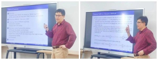 然后,张正军教授比较了VaR与MMVaR的特征,从具体的一阶自回归模型的例子出发,比较了MMVaR、EVaR、CVaR的指标区别,发现了MMVaR具有更大的增量空间,更能体现金融市场的特点。张正军教授构造了一个特殊具体的随机序列,发现了CVaR与MMVaR衡量的组合风险存在大于个体风险之和的情况,不满足风险度量的次可加性,不满足次可加性的这一现象引发了众多教授之间就这一问题的讨论交流,但是张正军教授正是想通过这个例子表明次可加性是可以不满足的,VaR与MMVaR同样不满足次可加性。