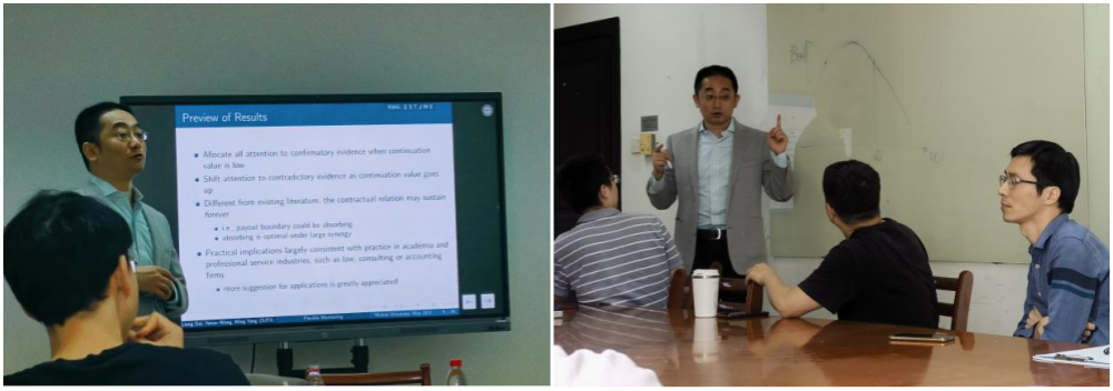 戴亮副教授通过将信息设计纳入动态合同框架,研究了委托人联合最佳监控(monitoring scheme)和补偿方案(compensation scheme)以激励代理人的策略。委托人可以在寻求证实或反驳代理人努力的证据之间灵活地分配有限的监控能力,作为奖励或惩罚的基础。研究发现当代理人持续价值较低时,委托人只寻求奖励性证据(confirmatory evidence);当价值超过一定阈值时,委托人主要寻求惩罚性证据(contradictory evidence)。重要的是,当且仅当代理人有足够的生产力时,该合同关系会一直持续。在实践上,该动态合同框架基本符合学术界、法律、咨询等行业现状。