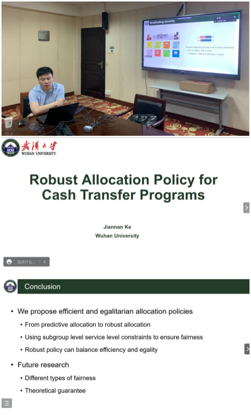 陈植元首先对柯剑男老师及对谈嘉宾进行了介绍。在汇报环节,柯剑男老师提到现金转移支付项目是有效缓解贫困的政策之一,实施现金转移支付项目的过程包括市场评估、受益人定位和分配三个步骤。然而依托于市场评估结果容易错误地定位贫困人群,造成分配不公平和资金的浪费。基于中国贫困家庭调查数据,考虑贫困人群资金需求预测和定位偏差,他提出了扶贫资金的鲁棒分配模型并设计了分配策略,发现相对于传统的按比例分配等分配策略,鲁棒分配策略在公平性和有效性上有更好的表现。此外,柯剑男指出未来研究可以进一步采用其他衡量公平性的方式来检验鲁棒分配模型的有效性,以及从理论上为鲁棒分配模型提供支持。