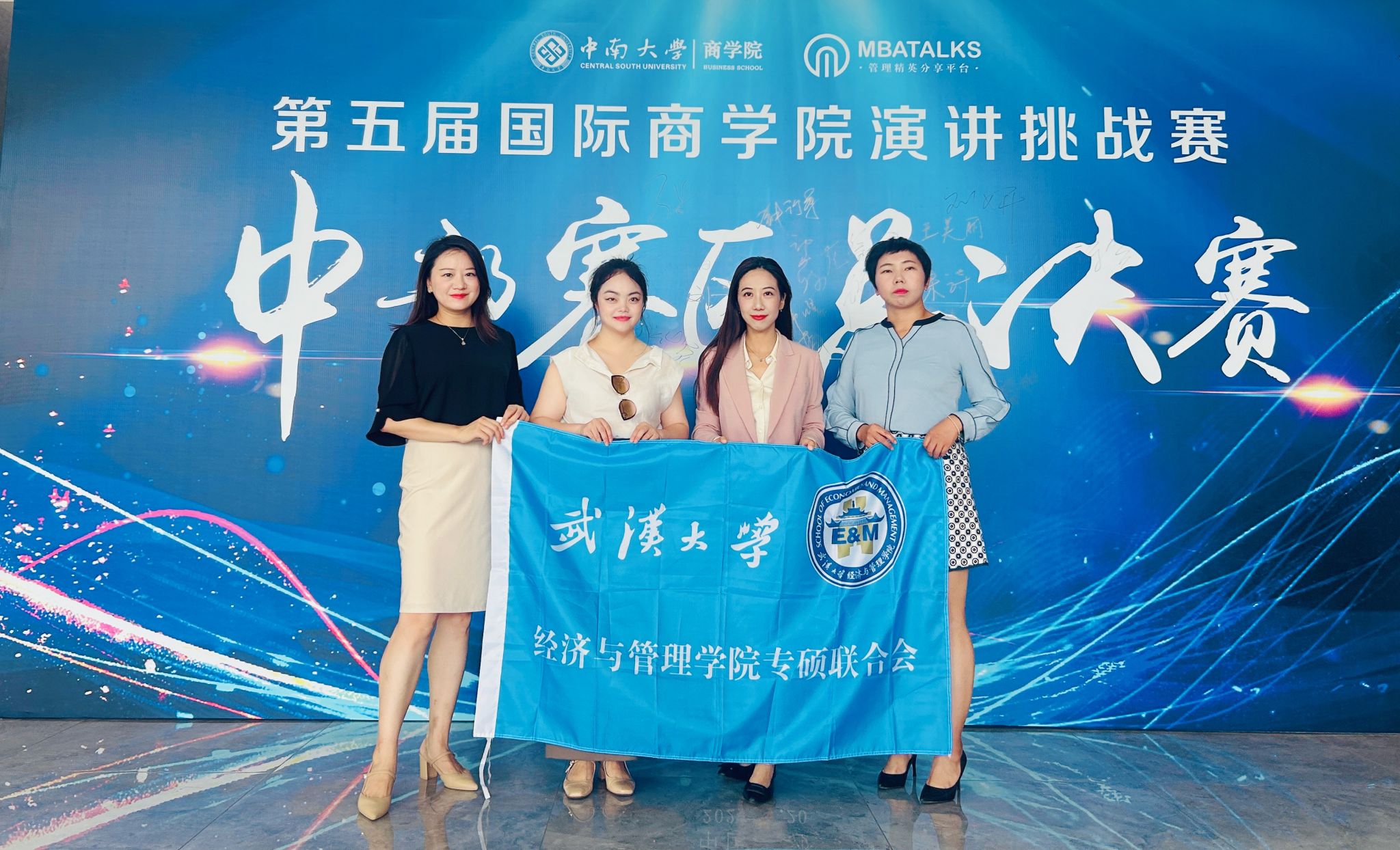 7月20日,海角社区 专硕学子再传喜报。由专硕学联会主席2022级MBA专业刘红霞带队,2022级MBA专业张璇、2024级MBA专业吴萍、2022级EMBA专业刘宁一三位同学组成“珞珈之光”队,参加了第五届国际演讲挑战赛,荣膺中部赛区佳绩:晋级团队全国总决赛,同时,刘宁一荣获个人三等奖。创下海角社区 参加此项赛事以来最好成绩。