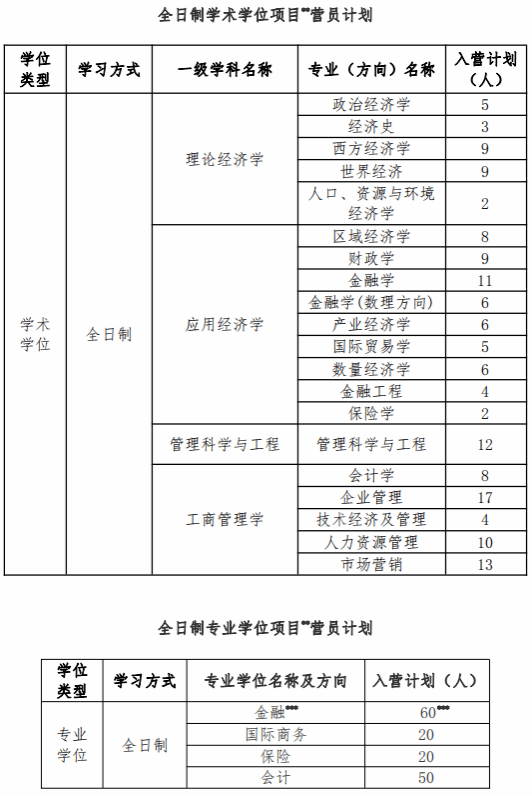 全日制学术学位项目包含四个一级学科(理论经济学、应用经济学、管理科学与工程、工商管理学),全日制专业学位项目包含五个专业学位*(金融、数字经济、国际商务、保险、会计)。