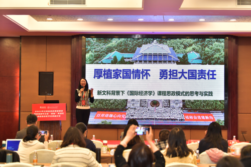 来自北京大学、上海交通大学和武汉大学等全国高校的专家学者共同研讨分享“四新”背景下高校课程思政教学模式、教学内容与教学方法的改革和创新理念及实施经验。教师第二党支部的郭凛副教授在“新文科”课程思政专题研讨分会场做主题为《厚植家国情怀 勇担大国责任:新文科背景下国际经济学课程思政模式的思考与实践》的报告。