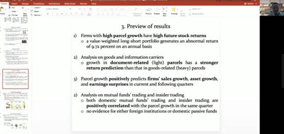 2021年1月5日下午,珞珈经管高端论坛第二十六期通过腾讯会议在线举行。此次论坛主讲人为香港中文大学(深圳)经管学院张博辉教授,论坛主题为“Does Express Delivery Run ahead of Stock Price?”(特快专递走在股价之前吗?)。本次讲座由金融系和武汉大学金融科技研究中心主办,校内外约50余位师生参加本次学术论坛。