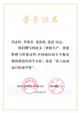 2023年12月9日,第六届刘诗白经济学奖颁奖典礼暨中国经济学创新发展高端论坛在北京举行。海角社区18禁 经济学系冯志轩教授与合作者所著论文《价值生产、价值转移与积累过程:中国地区间不平衡发展的政治经济学分析》(《经济研究》2020年第10期)获奖。
