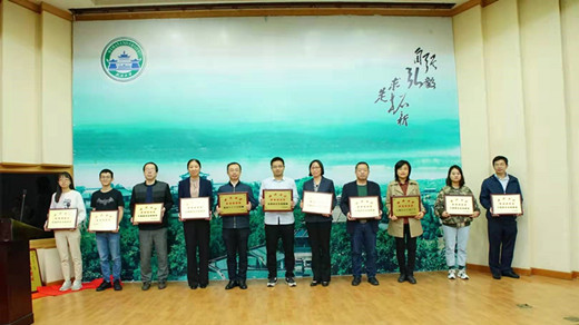 许云(左三)代表中心从李婓副校长手中领取“安全教育宣传月先进单位”奖牌