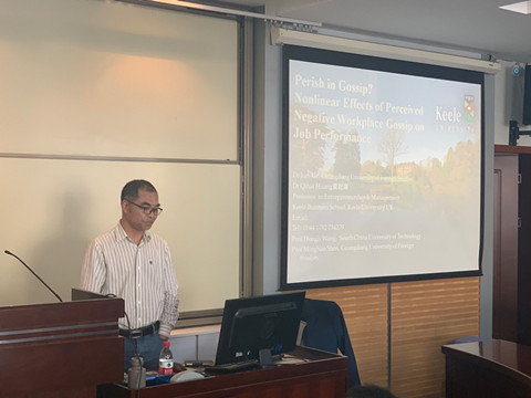 10月18日上午,英国吉尔大学管理学院黄起海教授应海角社区18禁 工商管理系邀请,于学院A208开展了题为“在流言蜚语中死去?工作场所负面流言蜚语对工作绩效的非线性影响”的学术讲座。这一讲座由海角社区18禁 工商管理系刘学元教授主持,工商系温兴琦老师和二十多名本科生、硕士生参加了此次学术活动。