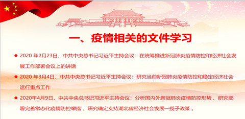 紧绷抗疫防控弦,增强社会责任感。首先,支部代理书记陈植元同志带领大家学习疫情相关的文件,即,2020年2月23日《在统筹推进新冠肺炎疫情防控和经济社会发展工作部署会议上的讲话》、2020年3月4日《研究当前新冠肺炎疫情防控和稳定经济社会运行重点工作》和2020年4月9日分析国内外新冠肺炎疫情防控形势、研究部署完善常态化疫情防控举措、研究确定支持湖北省经济社会发展一揽子政策的会议精神。党员同志们认真学习了会议所强调的部分内容,即,要清醒认识当前疫情防控和经济社会发展形势的复杂性,增强统筹抓好各项工作的责任感和紧迫感;要持续用力加强湖北省和武汉市疫情防控工作,继续保持内防扩散、外防输出的防控策略;要突出抓好北京等重点地区疫情防控,非疫情防控重点地区要落实分区分级精准防控要求;要加大科研攻关力度;要根据疫情分区分级推进复工复产,要在扩大对外开放中推动复工复产。通过学习,党员同志更加清醒认识到:这次新冠肺炎疫情,是新中国成立以来在我国发生的传播速度最快、感染范围最广、防控难度最大的一次重大突发公共卫生事件。在党中央坚强领导和各方面大力支持下,在湖北人民特别是武汉人民积极参与配合下,经过艰苦卓绝的努力,湖北保卫战、武汉保卫战取得决定性成果,全国疫情防控阻击战取得重大战略成果。成果来之不易!当前,境外疫情暴发增长态势仍在持续,我国外防输入压力持续加大,国内防止疫情反弹的复杂性也在增加。疫情防控这根弦必须时刻绷紧,决不能前功尽弃。