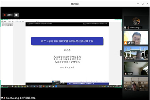 支部纪检委员肖光恩围绕自己在疫情期间的抗疫故事给支部讲了一堂生动的微党课,讲述了2020年1月至今他和武汉大学经济舆情研究基地的同事们如何利用各自的研究专长为中央以及省市各级党委和政府的抗击疫情和复工复产建言献策,充分体现了科学研究服务党和人民重大需要的初心。