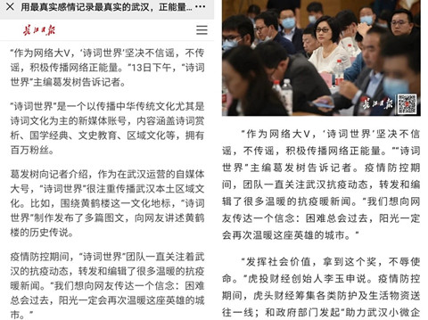 2020年1月以来,新冠疫情袭击武汉,诗意文化传媒积极响应党和政府号召,坚决不造谣,不信谣,不传谣,发表了多篇疫情相关作品,阅读量近70万,“在看”量7539,传播影响力上百万人次。例如,原创作品《你好,湖北,我是李白!》获得10万+阅读量,原创作品《武汉封城23天:这10个普通人的爱情故事,看哭了……》获得了8万阅读量,原创作品《“我的遗体捐国家”,这封七字遗书,让医生泪目:武汉,真是一座英雄的城市》、《视频|看哭了,一个武汉青年的封城日记》共计获得7万多阅读量,其他整合及转载文章如《31张武汉城市名片,感恩每一位驰援湖北的白衣天使》、《武大的早樱开了!网友:太美了,突然想哭》等,阅读量低则四五万,高则八九万,为武汉抗疫、振奋人心起到了非常好的作用。
