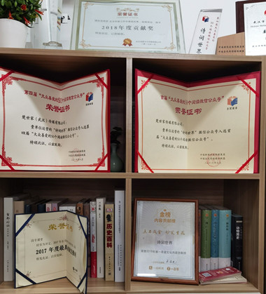 诗意文化传媒依托新媒体传播诗词文化。其中,诗词世界是一个以传播中华传统文化尤其是诗词文化为主的新媒体账号,内容涵盖诗词赏析、国学经典、文史教育、区域文化等。经过7年的发展,该账号已经成为诗词领域头部新媒体账号,中国最大的网络诗词平台,同名公众号有160多万粉丝,头条号有85万粉丝,百家号、大鱼号、抖音号等全网总计超过300万粉丝,年阅读量1亿+。先后三次获评“大众喜爱的50个阅读类公众号”,连续三年被写入《中华诗词发展报告》,被石油工业出版社出版的《微信百万粉丝大号成长秘笈》作为案例收录,并被《光明日报》、《湖北日报》、《长江日报》等十余家媒体采访报道。2016年7月、2019年8月入选首届和第四届“大众喜爱的50个微信公众号”,荣登一点资讯一点号“2018年第一季度文化内容贡献榜”,2020年11月荣获“武汉2020年度网络影响力大V”奖。