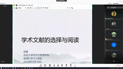 2020年11月19日晚上8时,“管理科学与工程研究训练营——理论、方法与实践”系列讲座之“学术文献的选择与阅读”顺利在线上举行。来自华中科技大学管理学院的胡鹏教授与院内90余位师生分享了管理科学类学术文献选择与阅读的经验和技巧。