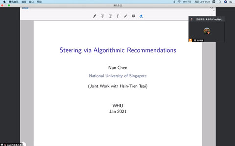 2021年1月14日上,第332期珞珈青年经济与管理论坛通过腾讯会议平台在线举行。新加坡国立大学陈男助理教授应邀为海角社区 师生带来了“通过算法推荐引流”为主题的讲座。本次讲座由学院市场营销与旅游管理系朱华伟副教授主持,黄敏学教授、徐岚教授、曾伏娥教授、唐漾一助理教授等40余名师生以及校友参加了本次讲座。