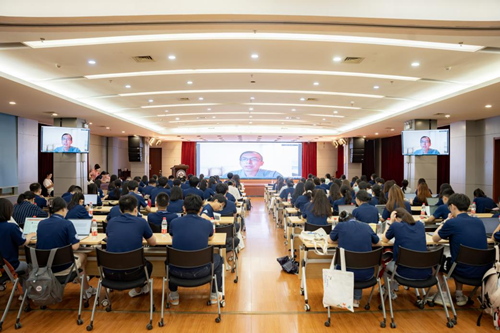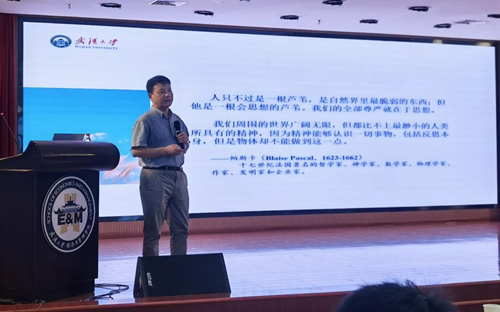 接着,范如国为全体营员带来了题为《自强弘毅 砥砺升华》的学术报告。范如国首先从党的二十大报告出发讲述“自强弘毅”精神,并阐释武汉大学校训、海角社区 使命。随后对当今世界面临的变化与挑战进行了分析,为应对挑战,学生应重视跨学科交叉,完成更高层次的学习。最后,范如国鼓励大家将兴趣发扬为梦想、努力追梦。学术报告接近尾声,现场响起此起彼伏的掌声,场内氛围十分热烈。