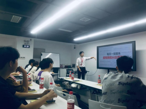 随后师生们走进公司的培训室,秋叶公司的哈雷老师给师生们进行了AI应用的培训,哈雷老师生动而有趣的讲述,吸引了师生们的注意力,并不时提出问题和哈雷老师交流。