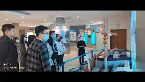(图中为展览馆工作人员为同学们讲解施工设备模型)