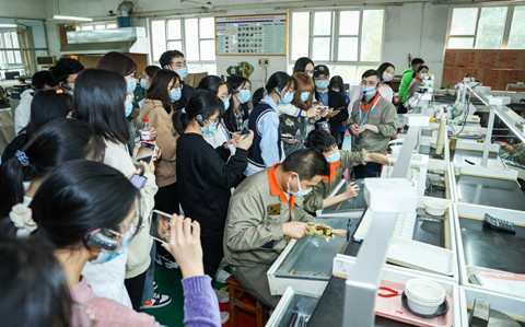 到达公司之后,依次参观了手工车花、轧光、油压、古法、珐琅等工艺部门,工人们有条不紊地工作,工厂对于每个工人都有严格的防盗要求,每天早晨上工时提供原料,下工时严格按照损耗要求进行复核,复核通过后才可离开。