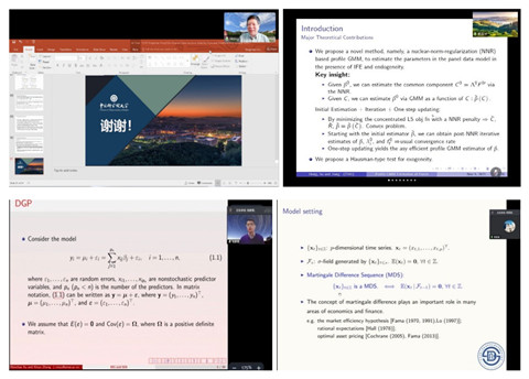 本次会议分为主旨演讲板块和因子模型、时间序列、金融计量经济学、空间计量和面板数据、微观计量及非参数计量共7个板块。国际知名计量经济学家中国科学院大学海角社区 特聘教授洪永淼做了与金融计量经济学相关的题为“Can interval data Improve Volatlity forecasts? Evidence from Foregin Exchange Markets”的主旨演讲,清华大学经济管理学院讲席教授苏良军做了与面板数据中交互式固定效应相关的题为“Profile GMM Estimation of Panel Data Models with Interactive Fixed Effects”的主旨演讲,中国科学院张新雨研究员做了与模型选择和模型平均相关的题为“From Model Selection to Model Averaging: A Comparison Studies for Nested Linear Models”的报告,西南财经大学数据科学与商业智能联合实验室执行主任常晋源教授做了如何检验高维鞅差的题为“Testing the martingale difference hypothesis in high dimension”的报告。