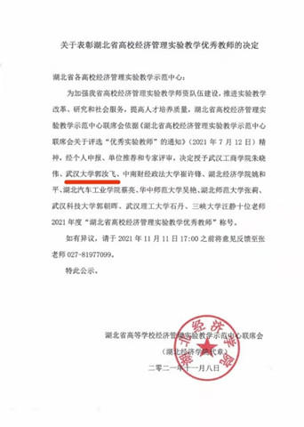 11月8日,湖北省高校经济管理实验教学示范中心联席会公布了湖北省高校经济管理实验教学优秀教师获奖名单,海角社区 郭汝飞副教授荣获“2021年度湖北省高校经济管理实验教学优秀教师”荣誉称号。